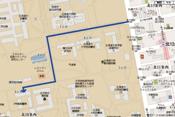 13条門より大学構内へ入り、工学部前交差点を左折、中央食堂を右手側に右折する。左手側理学部正面玄関から入り、右側通路突き当たり。