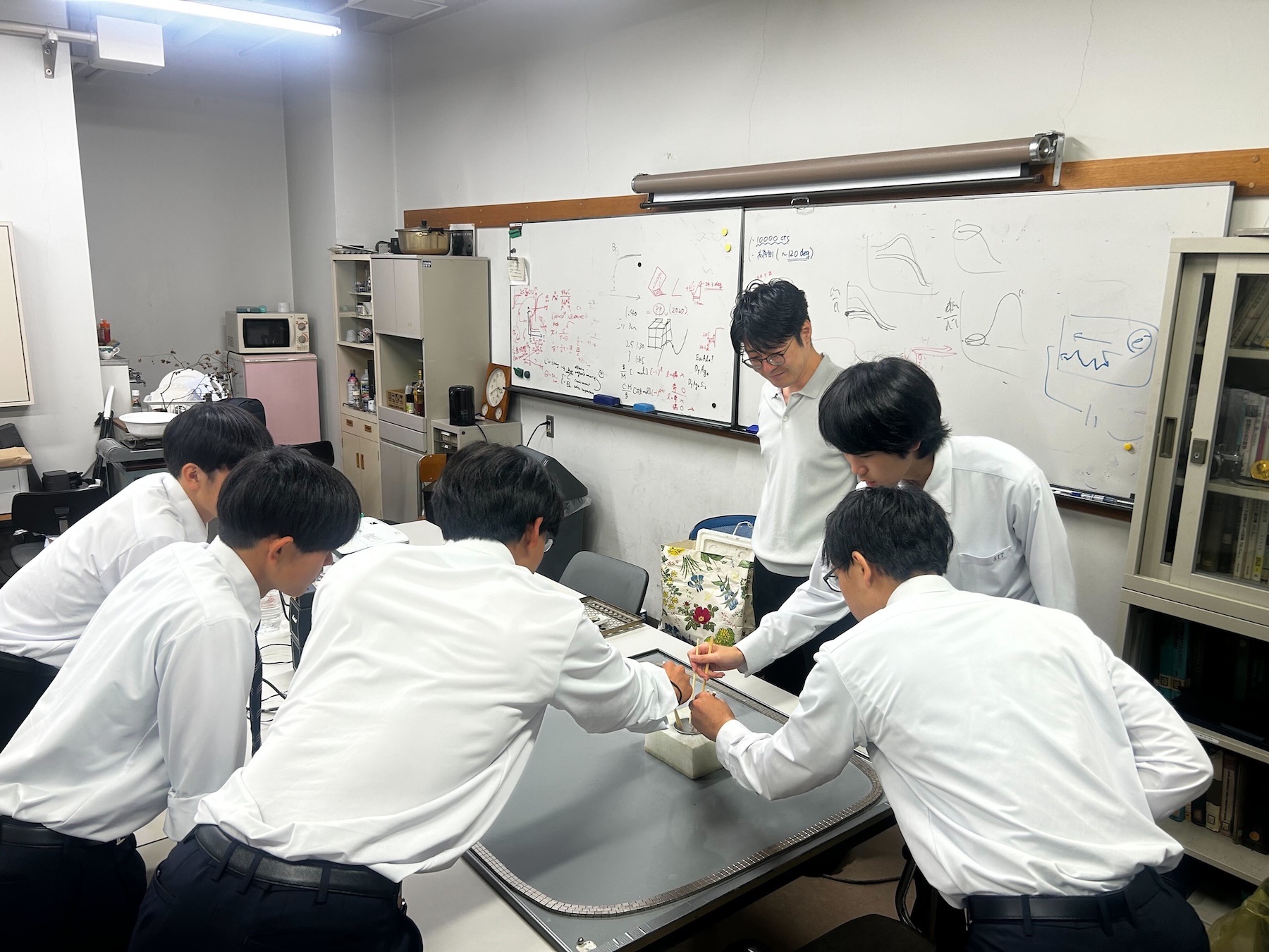 当研究室には現在2名のスタッフと14名の学生が所属し、議論を重ねながら協力して新物質の開発を進めています。研究室に所属した学生には、物質合成に必要な知識と技術を丁寧に指導します。実験器具の扱い方やガラス細工の仕方、固相法・イオン交換などのトポタクティック法・水熱を含むソルボサーマル法・高温高圧合成法・アーク法などの種々の合成法、化学反応論、状態図の見方、結晶学や化学結合論の基礎などがそれに該当します。これらを学ぶことで、酸化物、酸水酸化物、塩化物、金属間化合物など、無機物質の大半を合成できるようになります。
