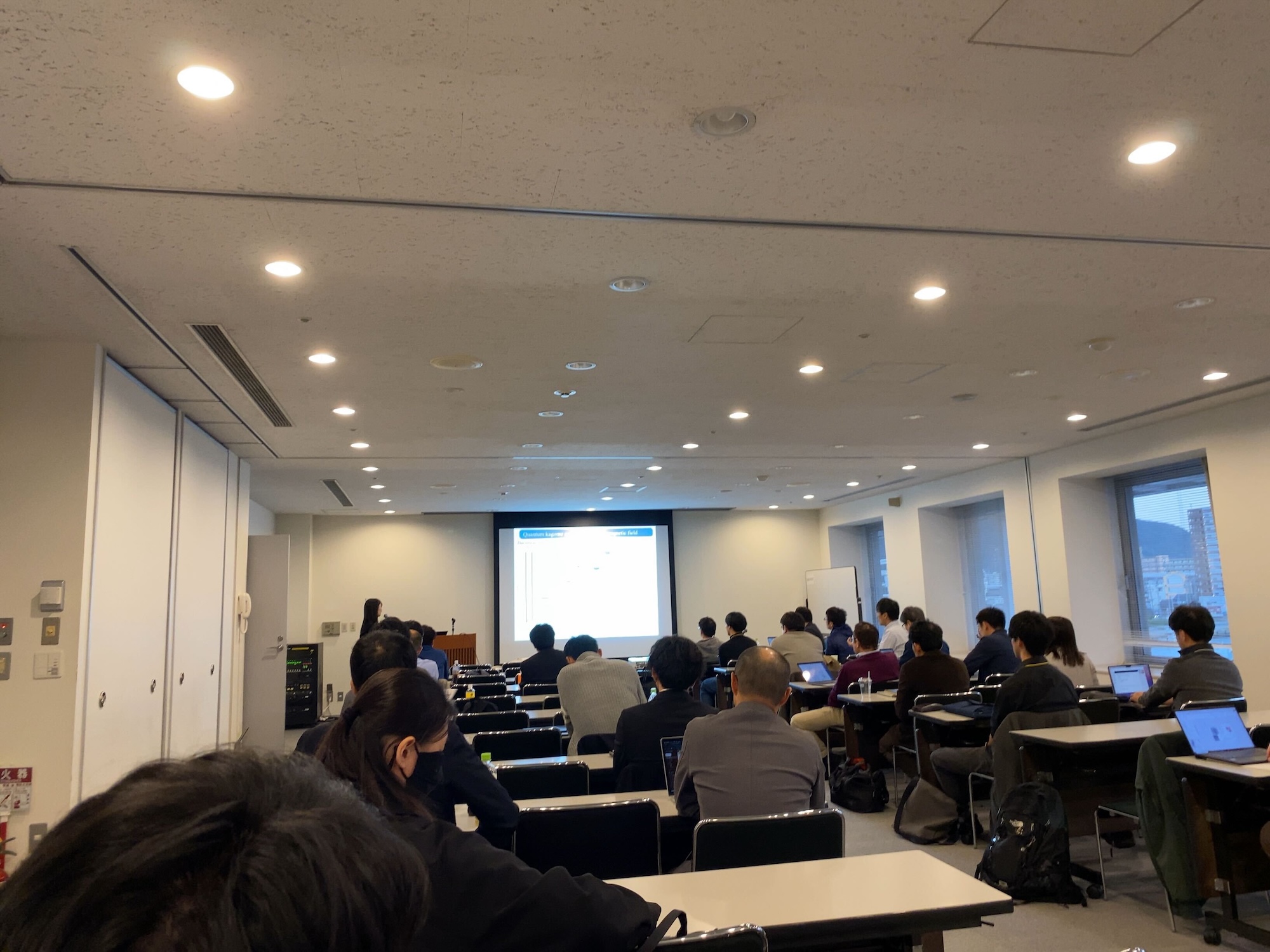 第35回日本MRS年次大会(@北九州市)で加藤さんと山田君が発表を行いました。山田君は初めての学会参加でしたがつつがなく発表を終えたようです。これから修論に向けてさらに物質を作る必要がありそうですが、うまくいけば面白い成果になると思います。写真は発表する山田君(赤シャツ)と加藤さん。